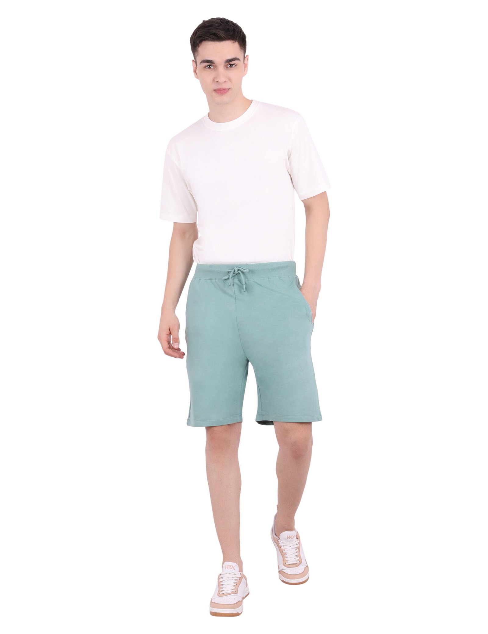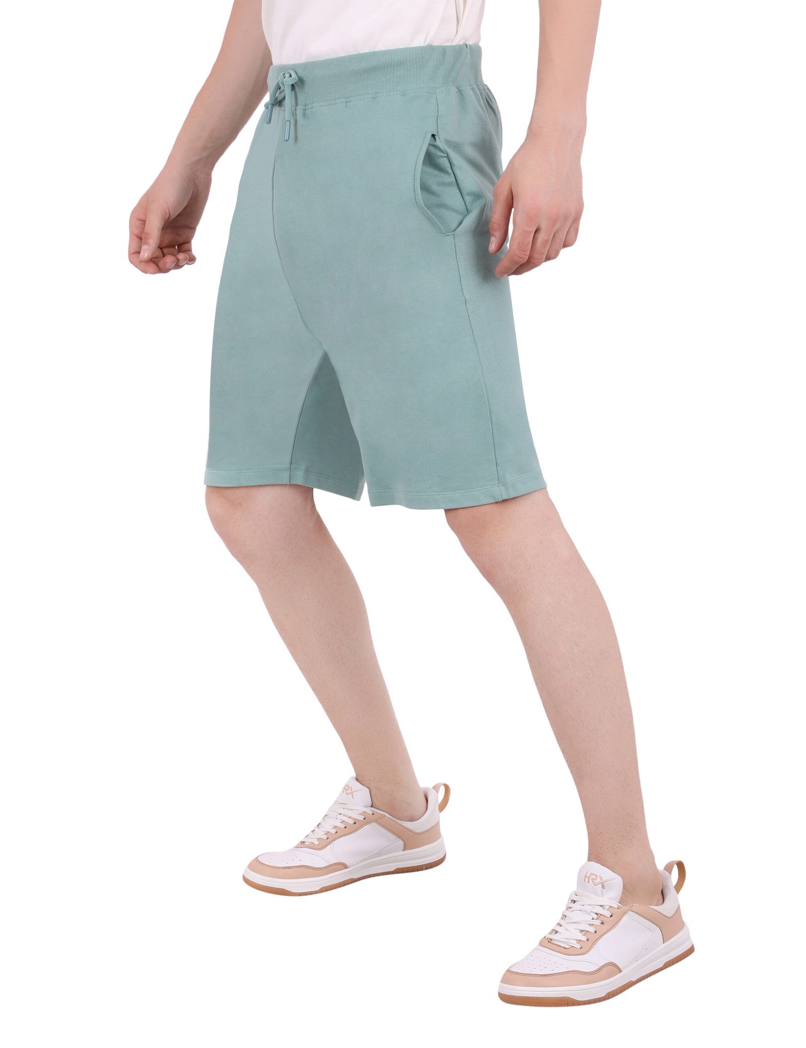 Stay cool and comfortable in these dusty mint knit shorts. Made from ultra-soft fleece jersey, they feature a relaxed fit, an elastic drawstring waist, and a versatile above-the-knee length, perfect for casual days.